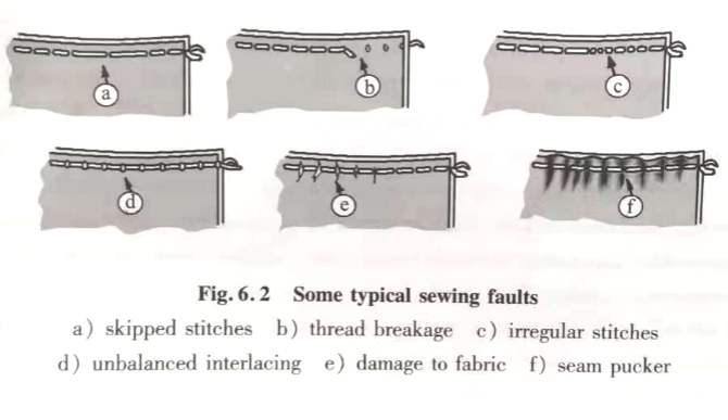 봉제 결함은 결함이있는 기계 부품에서 발생할 수 있습니다. 바늘이나 목구멍 판에 버려지면 실이 파손될 수 있습니다. 과도한 재봉 실 긴장 또는 구조적 재밍은 이음새를 유발할 수 있습니다. 또한, 운영자의 기술 저하는 이음새를 포함한 재봉 결함으로 이어질 수 있습니다. 일부 결함은 재료가 꿰매는 재료에 기인 할 수 있습니다. Seam Pucker는 때때로이 범주에 빠질 수 있으며 문제를 해결하는 한 가지 방법은 이음새 라인을 따라 숙박 테이프로 연결되어 굽힘 강성을 높이기 위해 스테일 테이프로 연결하는 것입니다.