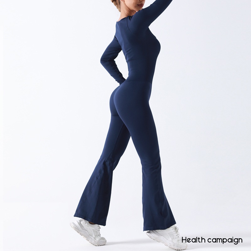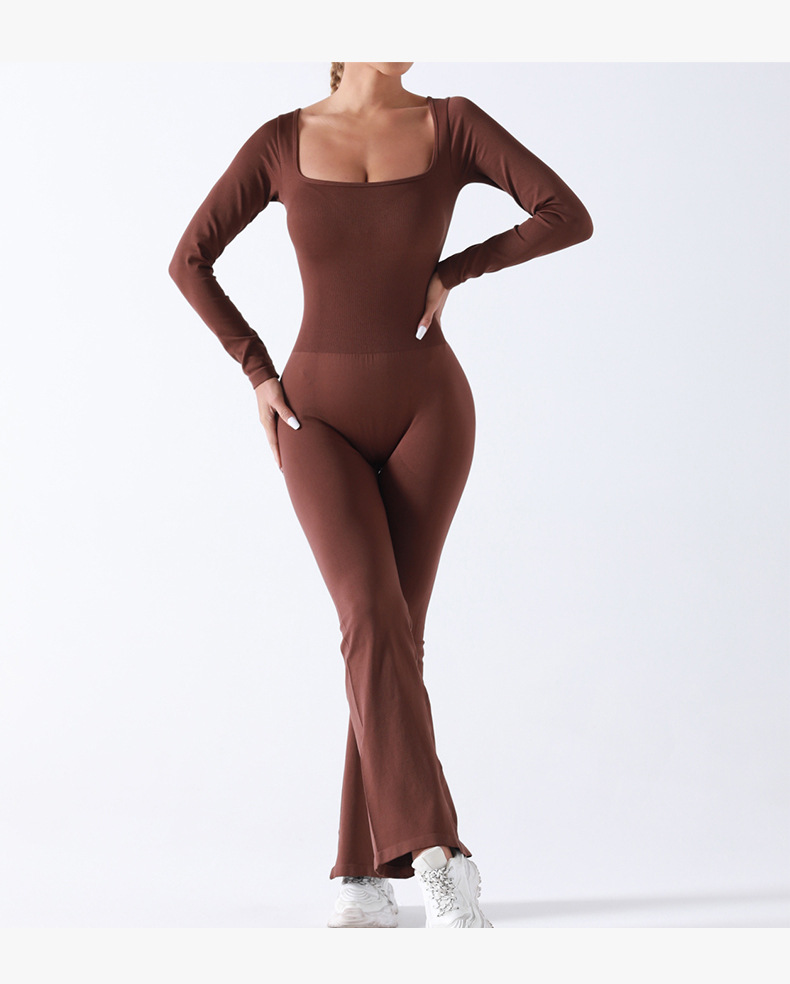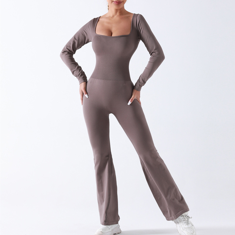 Seamless square neck long sleeve flared yoga jumpsuit, high stretch casual one-piece yoga onesis